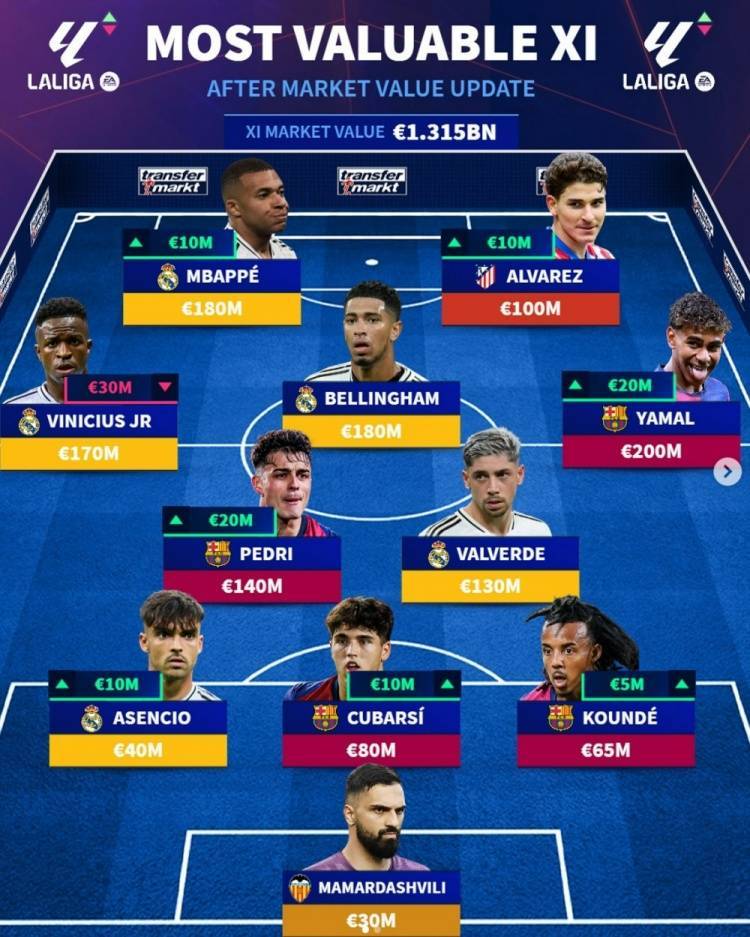 德转列更新后西甲最贵阵:亚马尔领衔,姆巴佩、贝林厄姆在列 admin 2025年06月10日 01:30 126 0 直播吧6月9日讯 德转更新了西甲球员身价,并盘点了目前西甲最贵阵容,其中亚马尔、姆巴佩、贝林厄姆在列,具体如下:门将:玛玛达什维利(瓦伦西亚,3000万欧)后卫:阿森西奥(皇马,4000万欧)、库巴西(巴萨,8000万欧)、孔德(巴萨,6500万欧)中场:维尼修斯(皇马,1.7亿欧)、佩德里(巴萨,1.4亿欧)、贝林厄姆(皇马,1.8亿欧)、巴尔韦德(皇马,1.3亿欧)、亚马尔(巴萨,2亿欧)前锋:姆巴佩(皇马,1.8亿欧)、阿尔瓦雷斯(马竞,1亿欧) 标签: #西甲 #瓦伦西亚 #阵容 #姆巴佩 #亚马尔 #贝林厄姆 #达什维利 #皇马 #玛玛 #巴萨