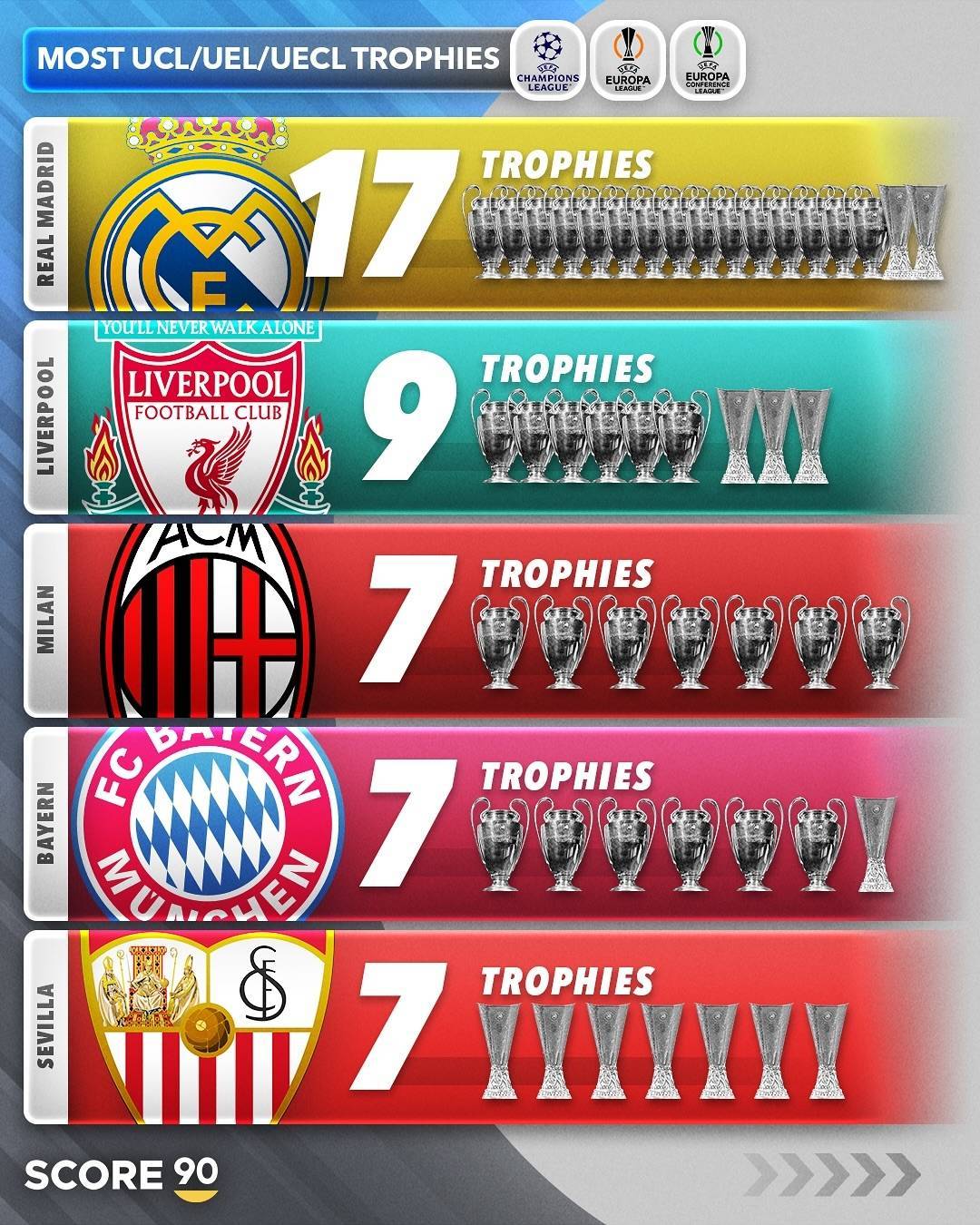 欧战(欧冠+欧联+欧协联)冠军数排行:
