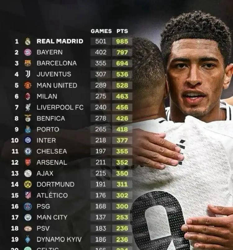 坦白说,今年皇马无论从整体实力还是当前状态来看,都难以成为欧冠冠军的热门球队之一。可即便如此,本赛季皇马也注定要写下欧冠历史的新篇章。赛季结束时,皇马累计欧冠积分达985分,加上本赛季已战胜4场,目前总积分为997分。换言之,仅差3分,皇马就将迎来队史第1000个欧冠积分的重要里程碑。